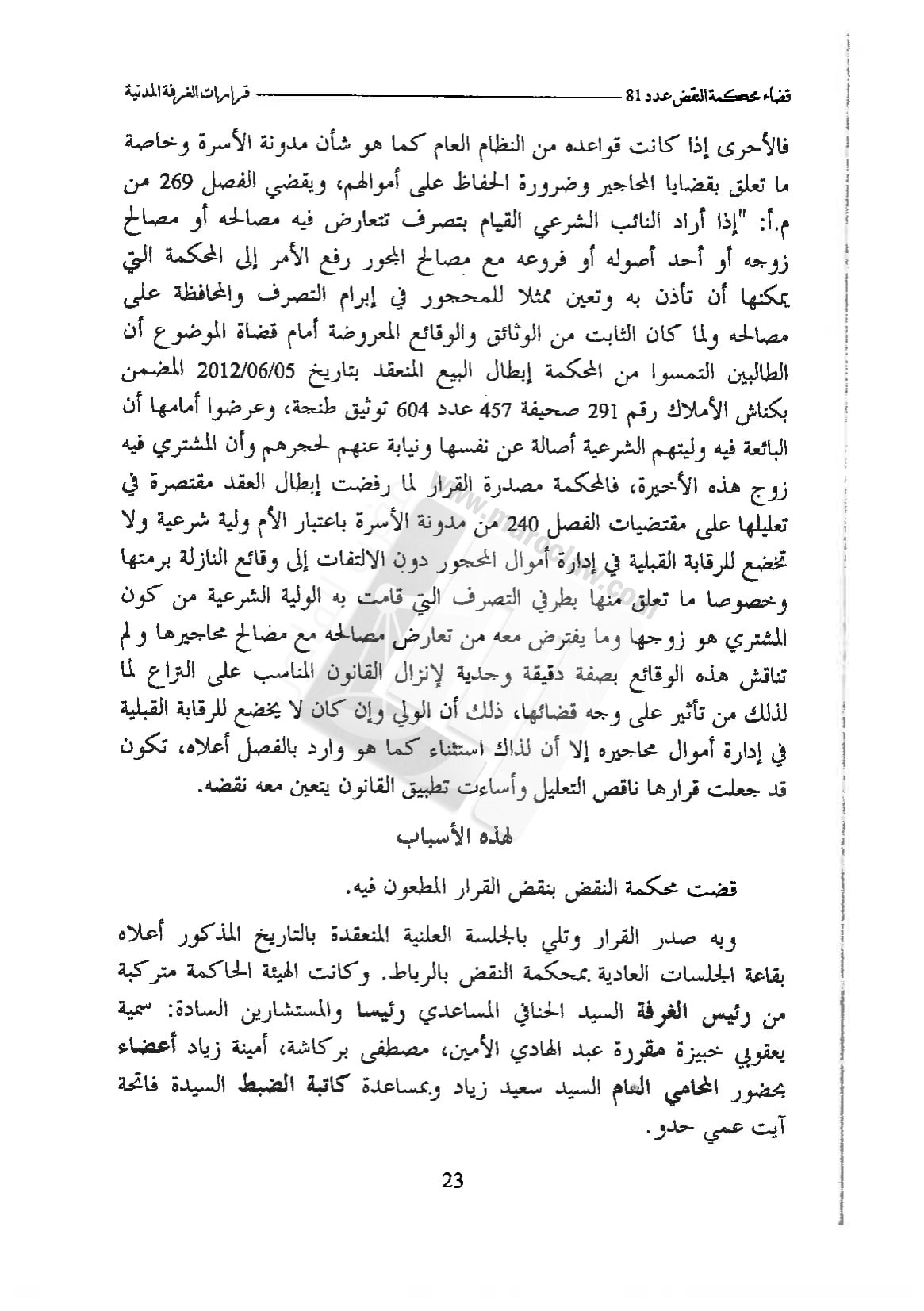 إن المحكمة لما رفضت إبطال العقد مقتصرة في تعليلها على مقتضيات الفصل 240 من مدونة الأسرة باعتبار الأم ولية شرعية و لا تخضع للرقابة القبلية في إدارة أموال المحجور دون الالتفات إلى وقائع النازلة برمتها وخصوصا ما تعلق منها بطرفي التصرف التي قامت به الولية الشرعية من كون المشتري هو زوجها وما يفترض معه من تعارض مصالحه مع مصالح محاجيرها ولم تناقش هذه الوقائع بصفة دقيقة وجدية لإنزال القانون المناسب على النزاع لما لذلك من تأثير على وجه قضائها، ذلك أن الولي وإن كان لا يخضع للرقابة القبلية في إدارة أموال محاجيره إلا أن لذاك استثناء كما هو وارد بالمادة 269 من مدونة الأسرة تكون قد جعلت قرارها ناقص التعليل وأساءت تطبيق القانون.