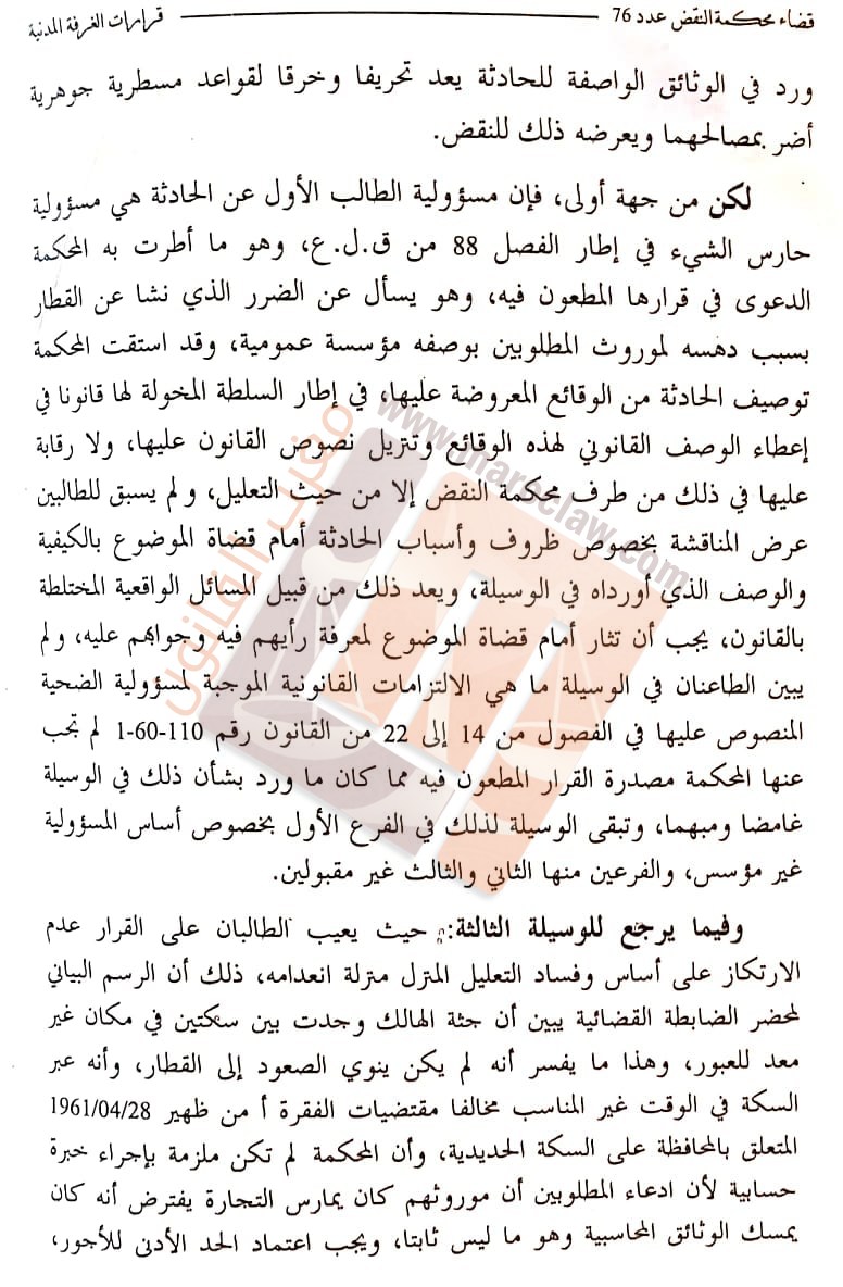 تدخل السكة الحديدية في مفهوم الطريق العام وإن كانت ملكا للمكتب الوطني للسكك الحديدية، وذلك لا يغير من طبيعتها العمومية، وفي دعوى التعويض بسبب الحادثة المتسبب فيها القطار ينعقد الإختصاص للمحكمة العادية، ويتحمل المسؤولية فيها المكتب الوطني للسكك الحديدية في إطار مسؤولية حارس الشيء طبقا للفصل 88 من ق.ل.ع.